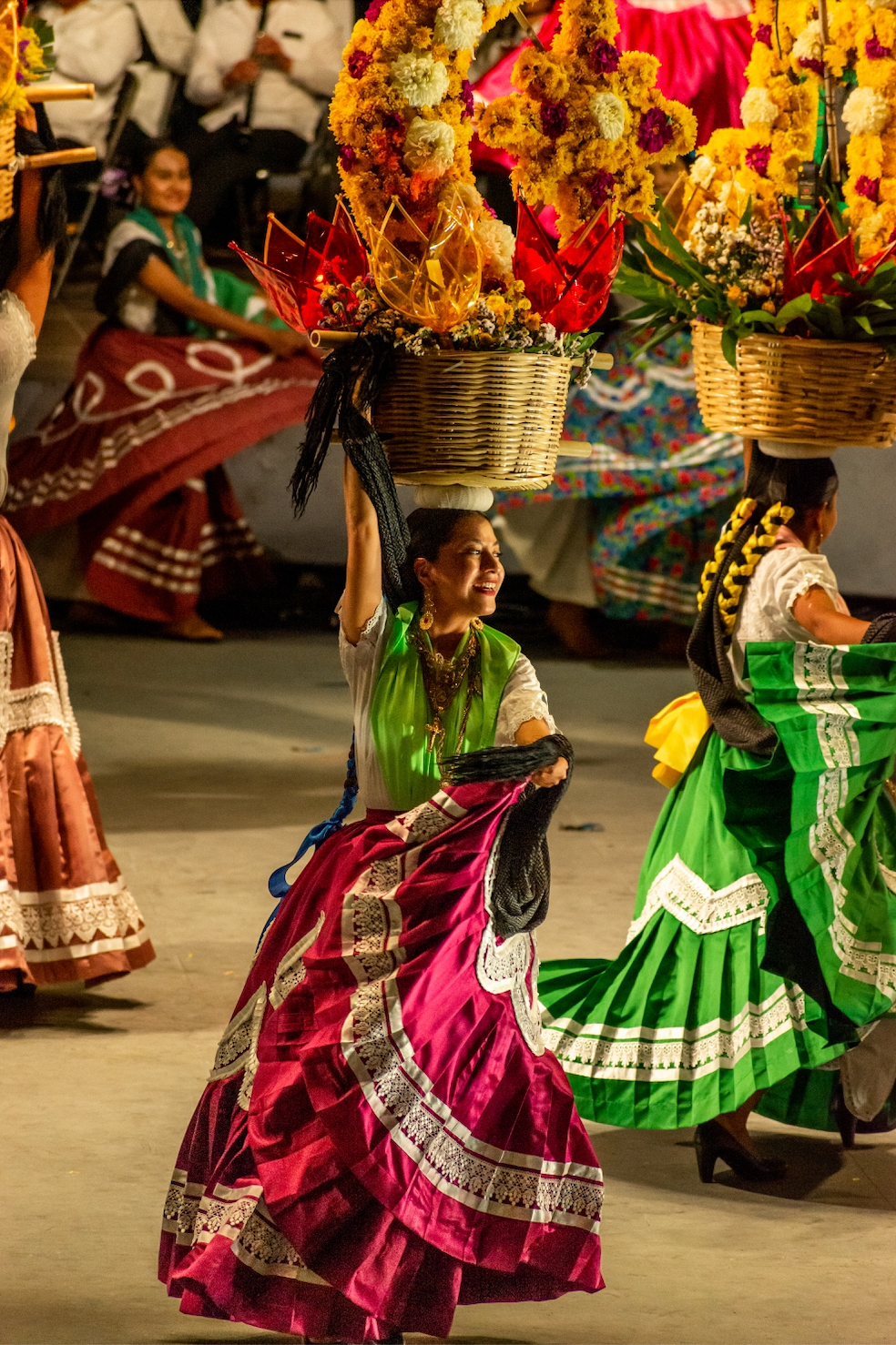 families celebrating together. Dancers twirl in their bright pink skirts,